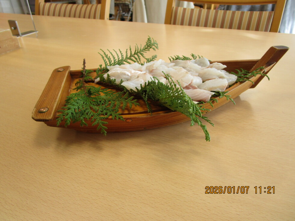 加賀海岸で釣りたての「スズキ」を頂いたので、僅かですが刺身で食べて頂きました。刺身の調理