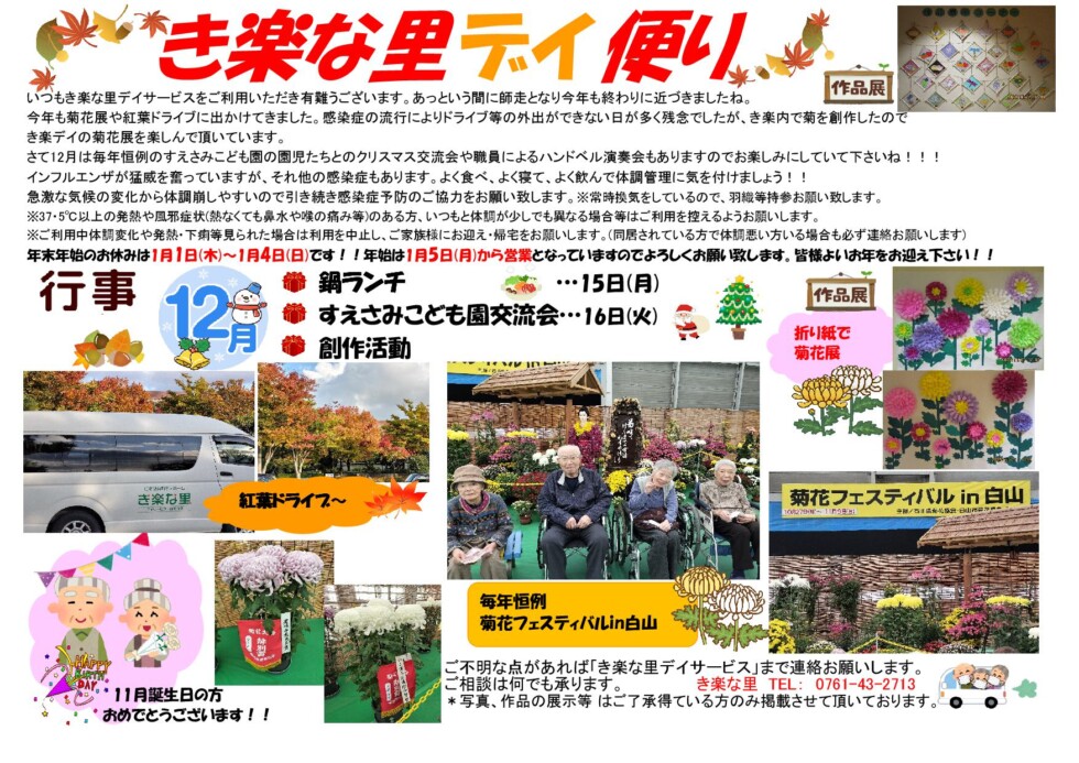 | いつもき楽な里デイサービスをご利用いただき有難うございます。あっという間に師走となり今年も終わりに近づきましたね。 |