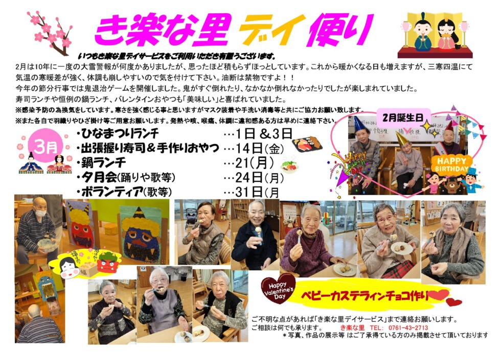 | ひな祭りや桜の開花状況によっては、花見ドライブも実施できればと思います。※感染や天気等の状況に応じてとなります |